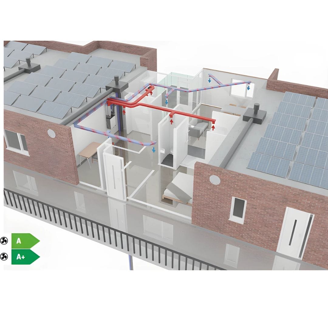 De Itho Daalderop WTW HRU 200 ECO Hoogbouw is een geavanceerd balansventilatiesysteem, ook wel warmteterugwinningssysteem (WTW) genoemd. Deze unit kan tot 200m³/h ventileren en is uitgerust met een handige eurostekker. De WTW-unit heeft vier aansluitingen aan de bovenzijde, speciaal ontworpen voor hoogbouwtoepassingen.