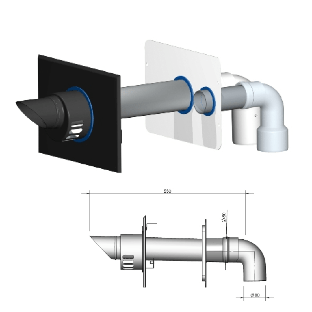 Veilige en betrouwbare rookgasafvoer met de 2-pijps muurdoorvoer AL 80-80 van Burgerhout, geschikt voor condensatie en overdruksystemen tot 200 °C. De combinatie van een aluminium rookgasbuis (Al Mg Si 0,5) en gecoate stalen luchttoevoerbuis garandeert duurzaamheid en ijspegelbestendigheid, terwijl de compacte afmetingen van 630 mm lengte en zwart-witte afwerking zorgen voor een naadloze integratie in renovatieprojecten.