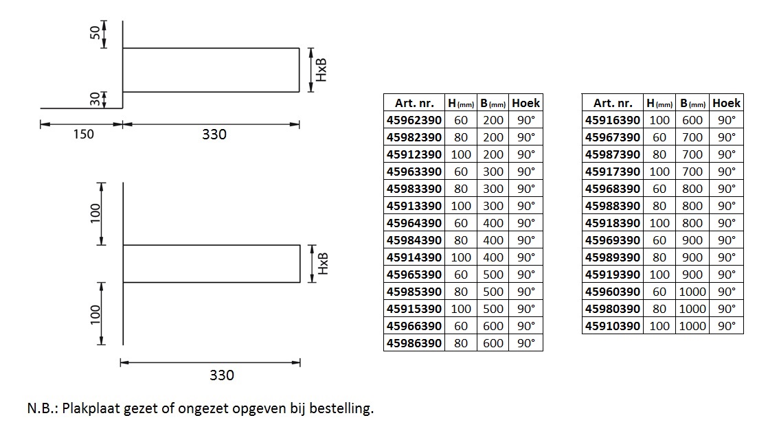 Lengte opstaande rand plakplaat |