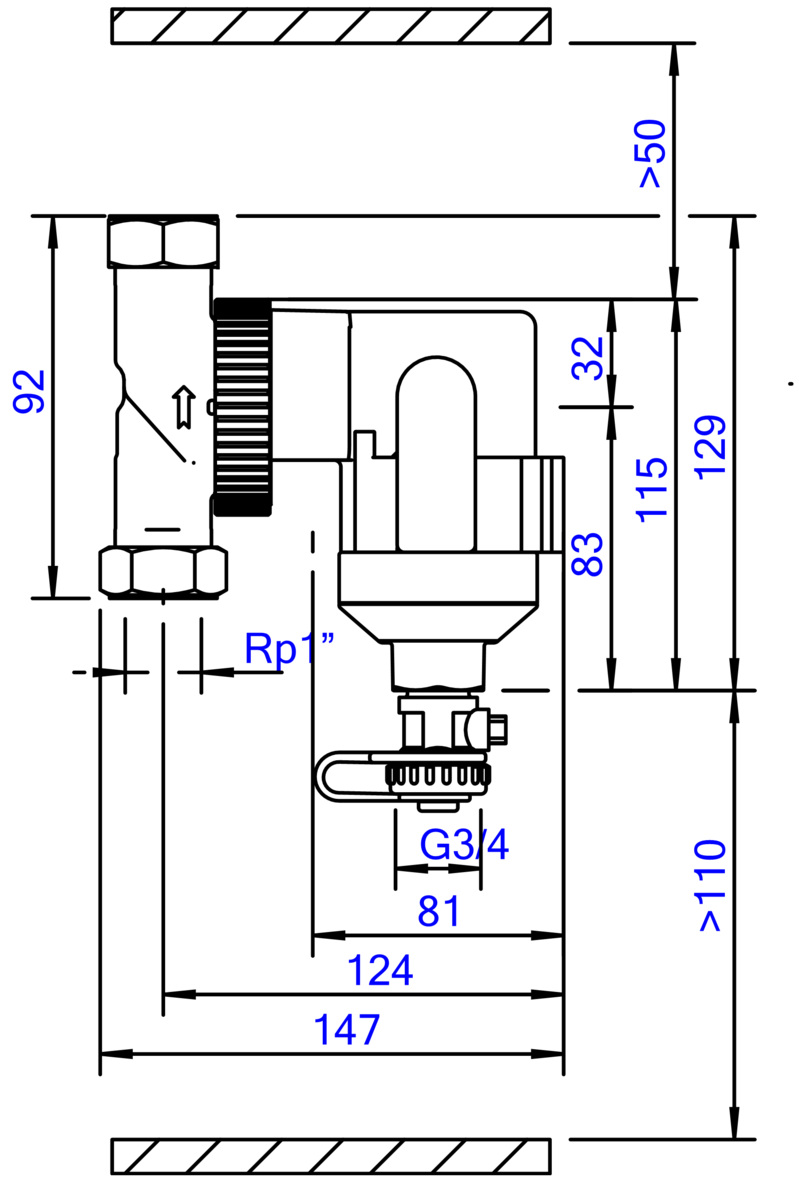 De behuizing en aansluitingen zijn vervaardigd uit messing, wat zorgt voor een lange levensduur en betrouwbare prestaties onder diverse omstandigheden. De bevestiging met binnendraad cilindrisch BSPT-Rp aansluitingen (ISO 7-1 / EN 10226-1) garandeert een veilige en standaard conforme montage. Met een compacte bouwlengte van 100 mm past deze vuilafscheider eenvoudig in verschillende systemen, zowel horizontaal als verticaal.